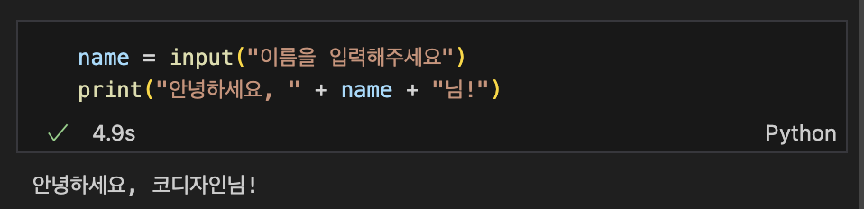 name = input("이름을 입력해주세요") print("안녕하세요, " + name + "님!")